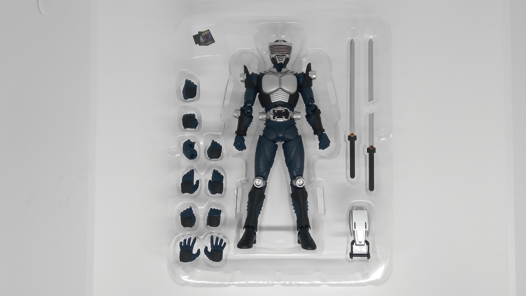 Aksesoris dari SHF Kamen Rider Ryuki Blank Form ini seperti biasanya selalu terdapat beberapa part tangan seperti seri SHF lainnya. Selain part tangan juga disediakan 3 kartu lain selain kartu kosong yang terpasang di beltnya. Kartu ini sendiri dibungkus dalam plastik segel yang sampai saat ini saya masih sayang untuk membuka bungkus plastik tersebut walau untuk keperluan foto :). Terdapat juga 2 pedang yang disediakan, yang pertama adalah 1 pedang panjang utuh dan satunya lagi adalah pedang yang terbelah menjadi 2. Terakhir aksesoris yang disediakan adalah alat yang digunakan ryuki untuk memasang kartu dan letaknnya dipasang di tangan kiri dari ryuki blank form ini.